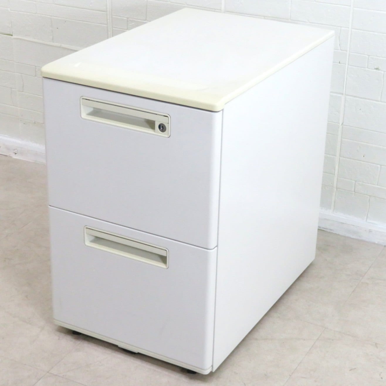 2段ワゴン ホワイト デスクワゴン 引き出し サイドキャビネット 二段 事務 書類 ラッチ機構 シンプル 整理 ワーク キャスター YH16024-1 中古オフィス家具 配送サイズ180