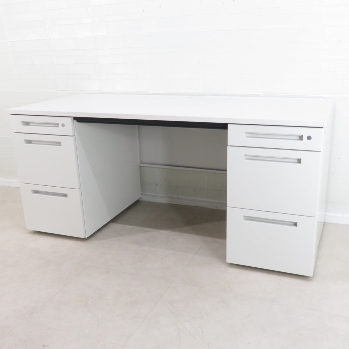 - SOLD OUT 両袖デスク オフィスデスク ホワイト 事務机 両袖机 白 シンプル 書類 整理 ワーク 浅型引き出し 収納 配線口 ペントレー AG19057 中古オフィス家具 配送サイズ350