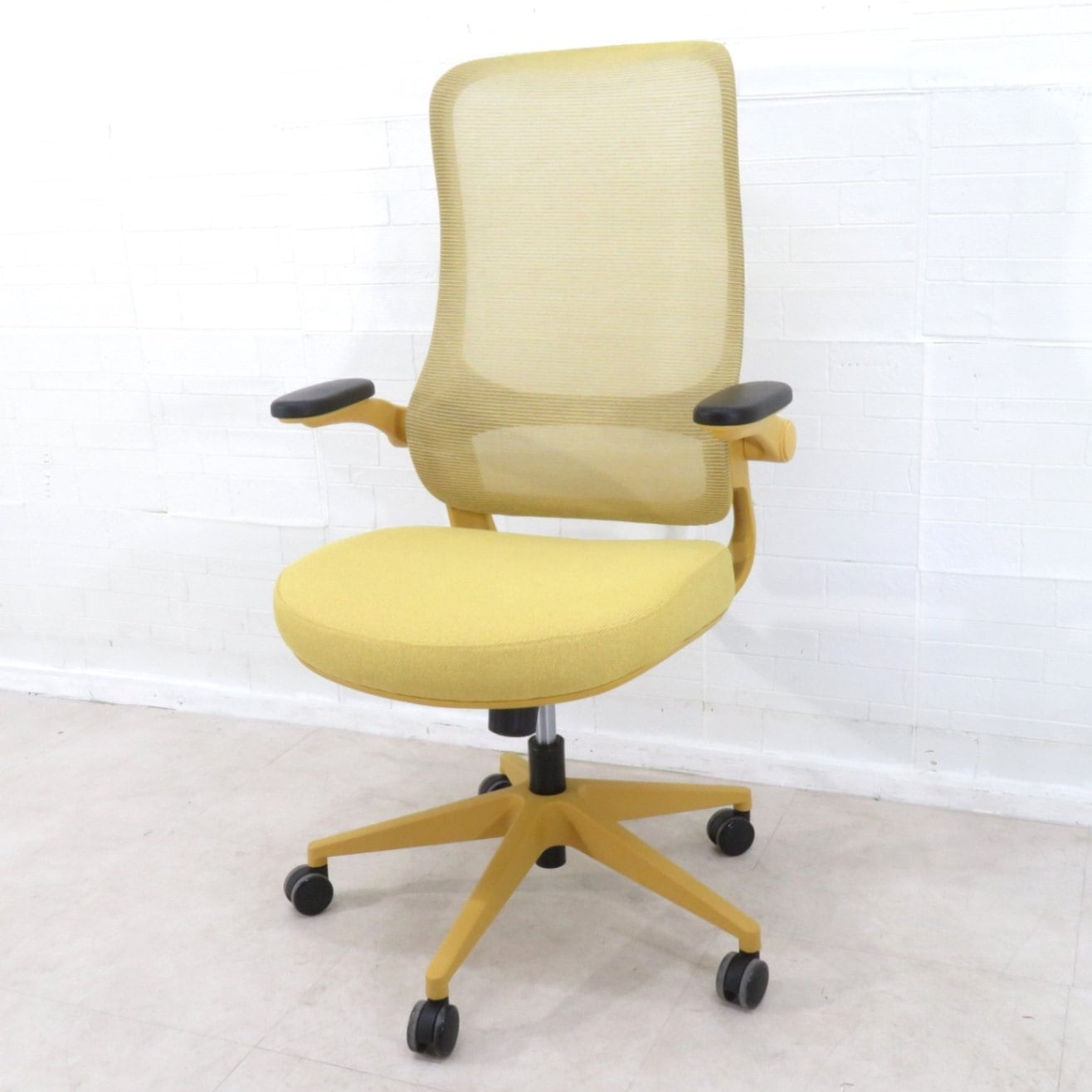 【展示品】 肘付オフィスチェア オーロラデザインチェア イエロー パステル メッシュ アジャスタブルアーム YH17125 中古オフィス家具 在宅 YH17125 中古オフィス家具 配送サイズ250