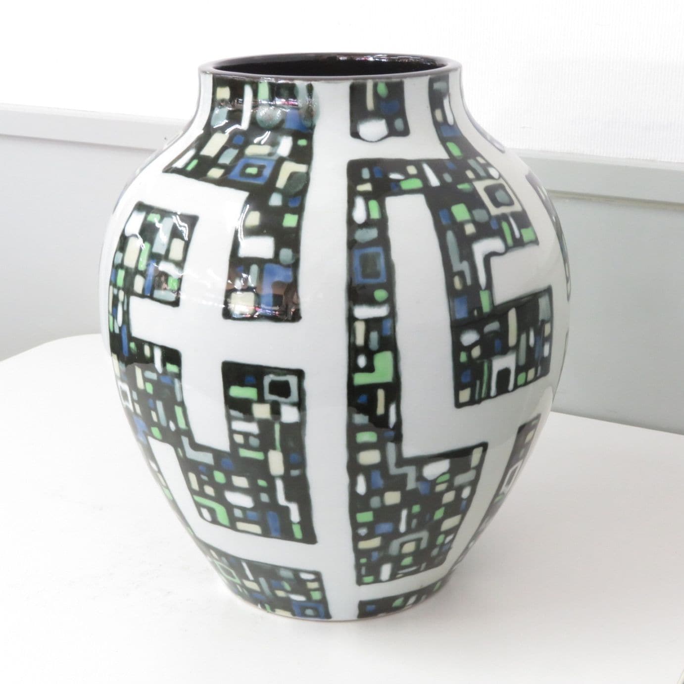 ガラス製の花瓶が入荷致しました。 白く太いラインと、黒、青、緑の色合いで構成された幾何学的な抽象模様が施されています。 花を生けるだけでなく、単独でオブジェとしても楽しめます。 インテリアのアクセントとして、リビングや玄関などにぜひいかがでしょうか。 |