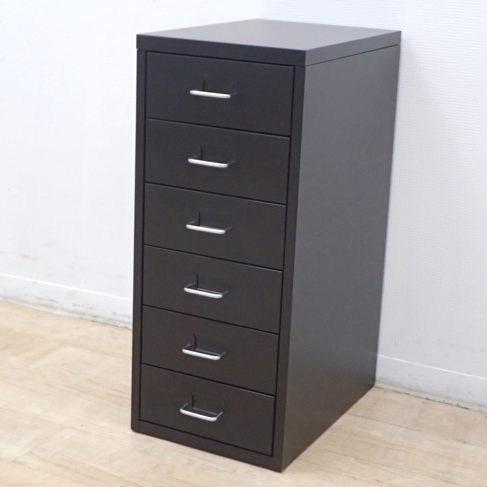 イケアのヘルメルが入荷いたしました。お色味はブラックです。 A4サイズ対応の6段引き出しユニット。 抜け落ち防止のストッパー付きなので安全にお使いいただけます。 ラベル挿しがあるので各段の収納物がわかりやすく、整理整頓に役立ちます。 シンプルでスタイリッシュなキャビネットです。オフィスやご自宅にぜひご活用ください。 ※こちらはキャスターが付いておりません。予めご了承ください。 ※写真で掲載の商品そのものが届くとは限りません。複数入荷した中の1点を掲載している場合がございます。 |