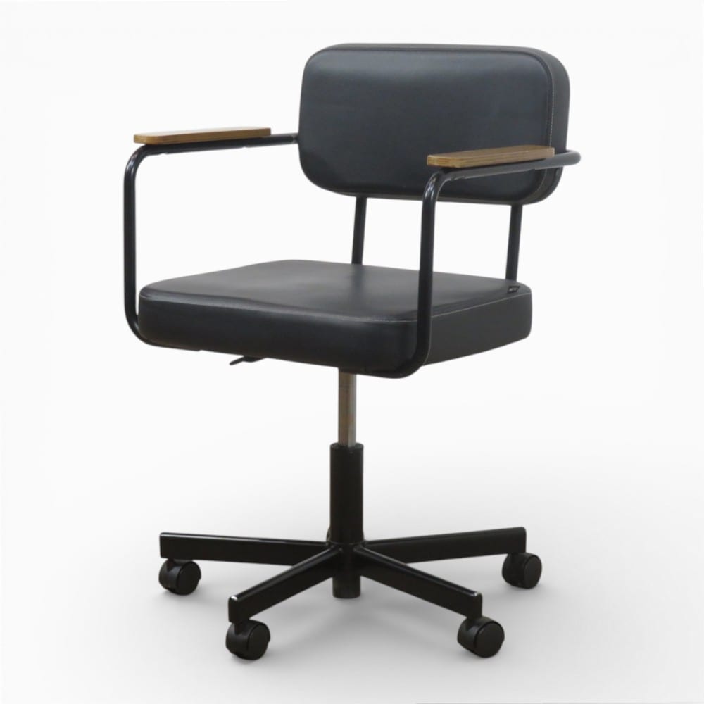 オフィスコム「METIO(メティオ)」シリーズのワークチェアです。 ブラックの合成皮革(PVCレザー)に、温かみのある木製アームレストを組み合わせたモダンな外観が特徴で、オフィスからホームオフィスまで、あらゆる空間にスタイリッシュに馴染みます。 背もたれと座面には厚みのあるウレタンフォームを採用し、長時間の作業でも疲れにくい快適な座り心地を実現しました。 また、座面下のレバーで高さを402mmから509mmの間で簡単に調整でき、体型やデスクに合わせた最適な姿勢を保てます。 お手入れしやすい合成皮革の張地や、スムーズな移動をサポートする5本脚のキャスターなど、機能面も充実。 落ち着いたヴィンテージ感漂うデザインは、デスクワークをより上質な時間へと変えてくれる一脚です。 ※写真で掲載の商品そのものが届くとは限りません。複数入荷した中の1点を掲載している場合がございます。 |
